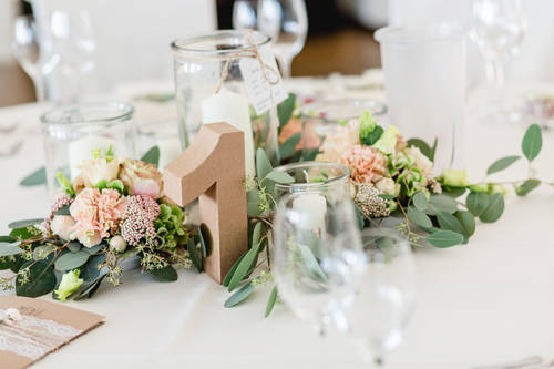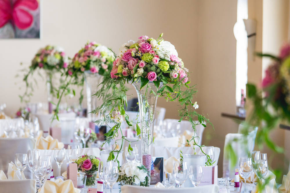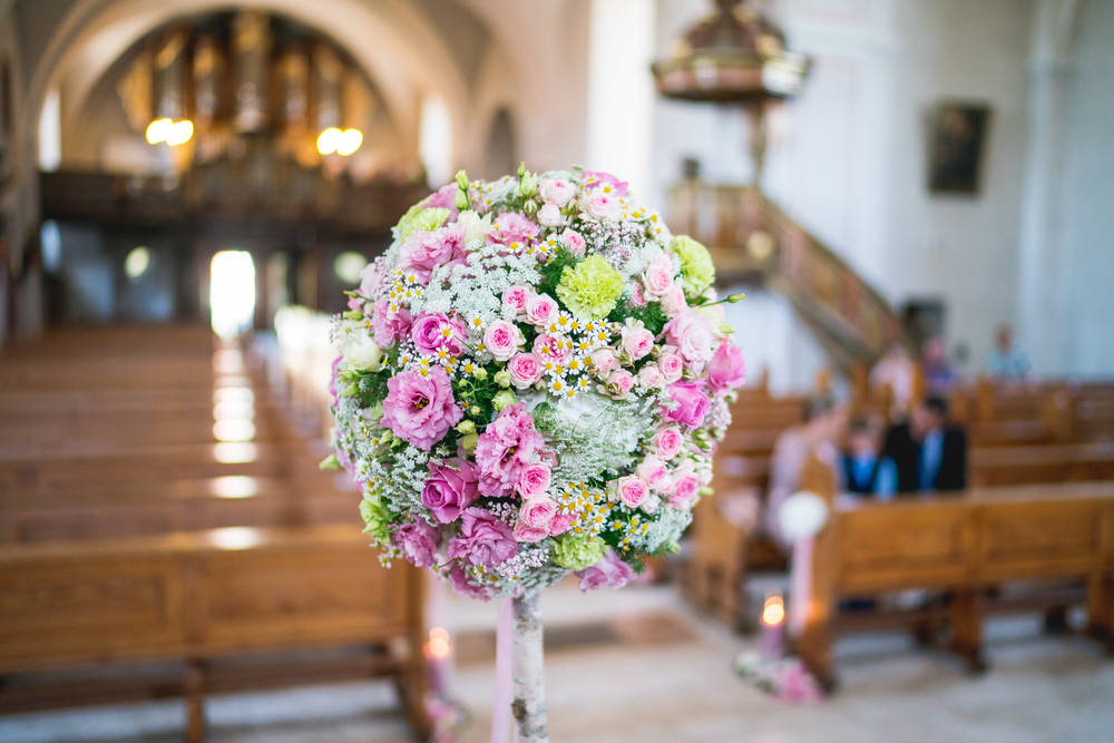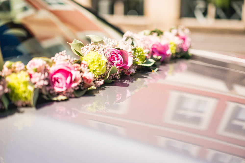 den Brautstrauß, den passenden Anstecker für den Bräutigam, die florale Dekoration der Hochzeitslocation, den Blumenschmuck für Standesamt und Kirche, Autoschmuck und vieles blumiges mehr.